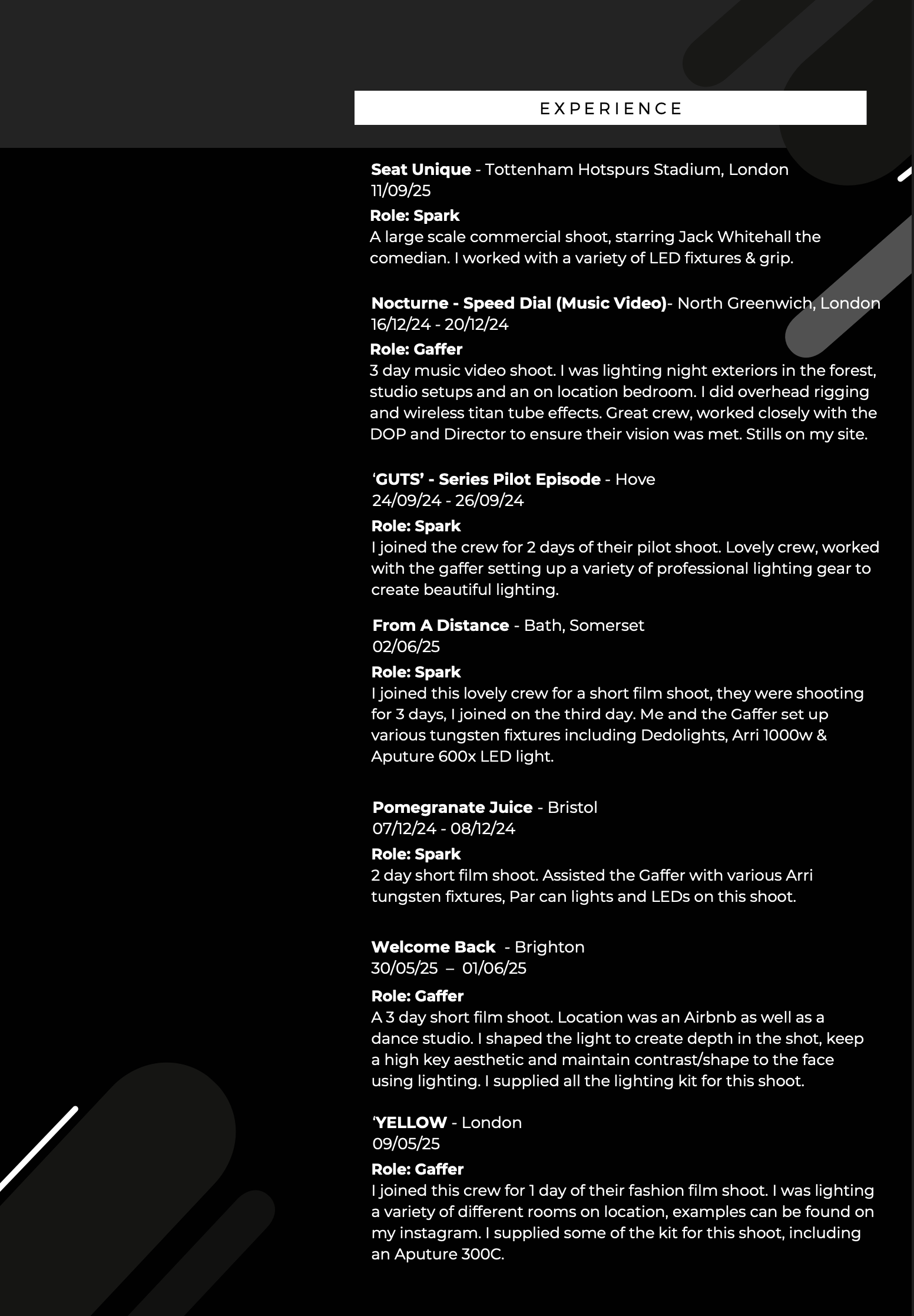I work as a lighting gaffer in Brighton, Bristol, London, East Sussex, West Sussex… wherever in England! See my experience below.